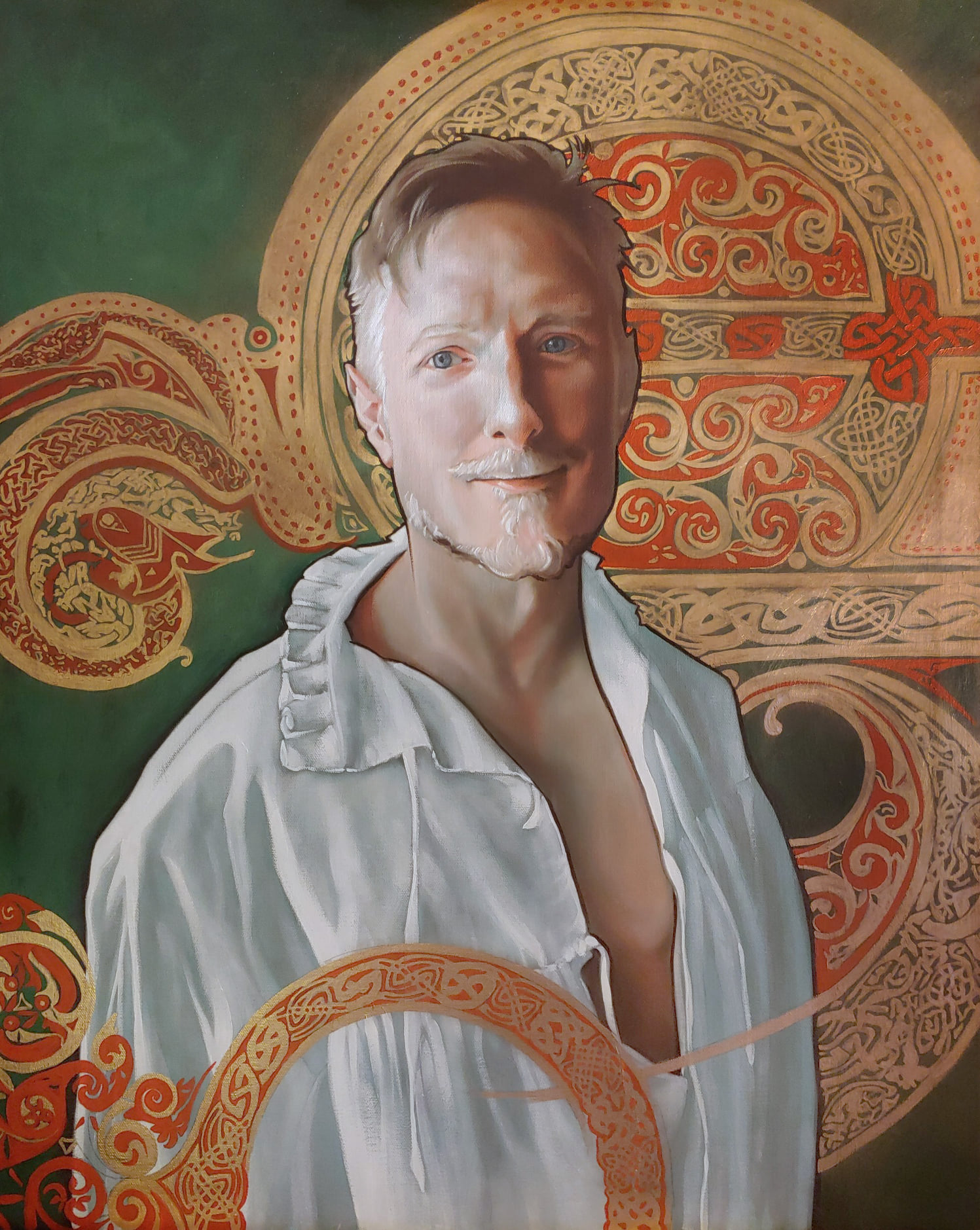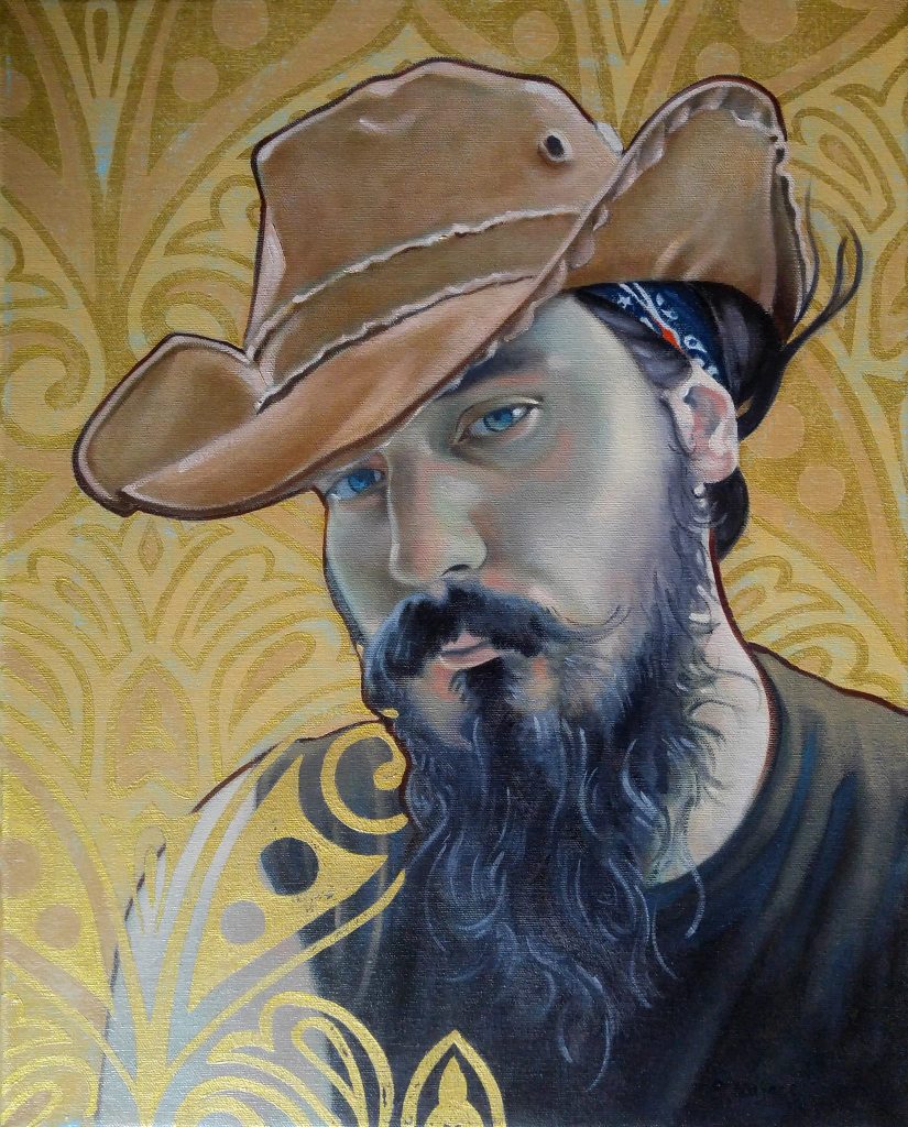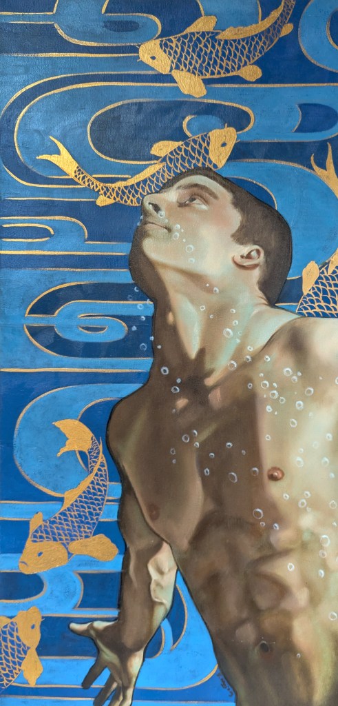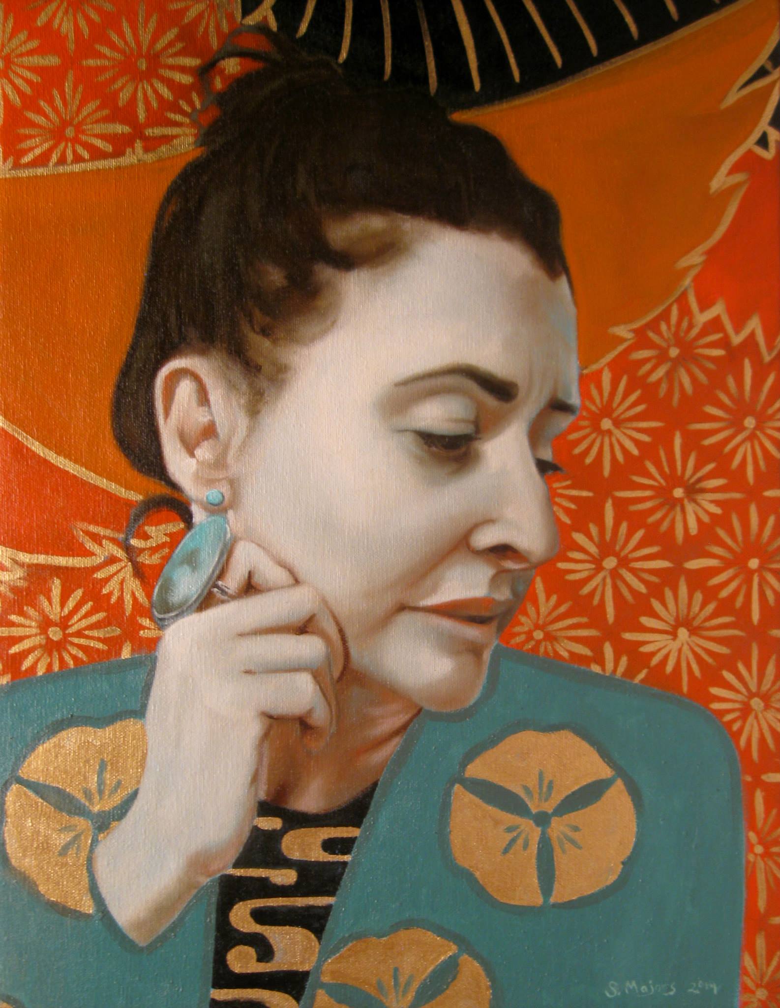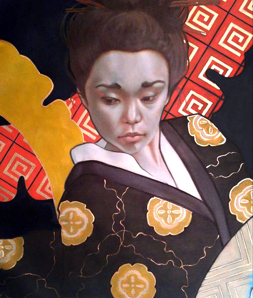 I’ve always been obsessed with Japanese art particularly the use of gold and woodblock prints. I began incorporating those inspirational elements from the beginning. Then being inspired by the relationship of kimono and obi and the juxtaposition of pattern and color I began to use that same concept for subject and background in my paintings.