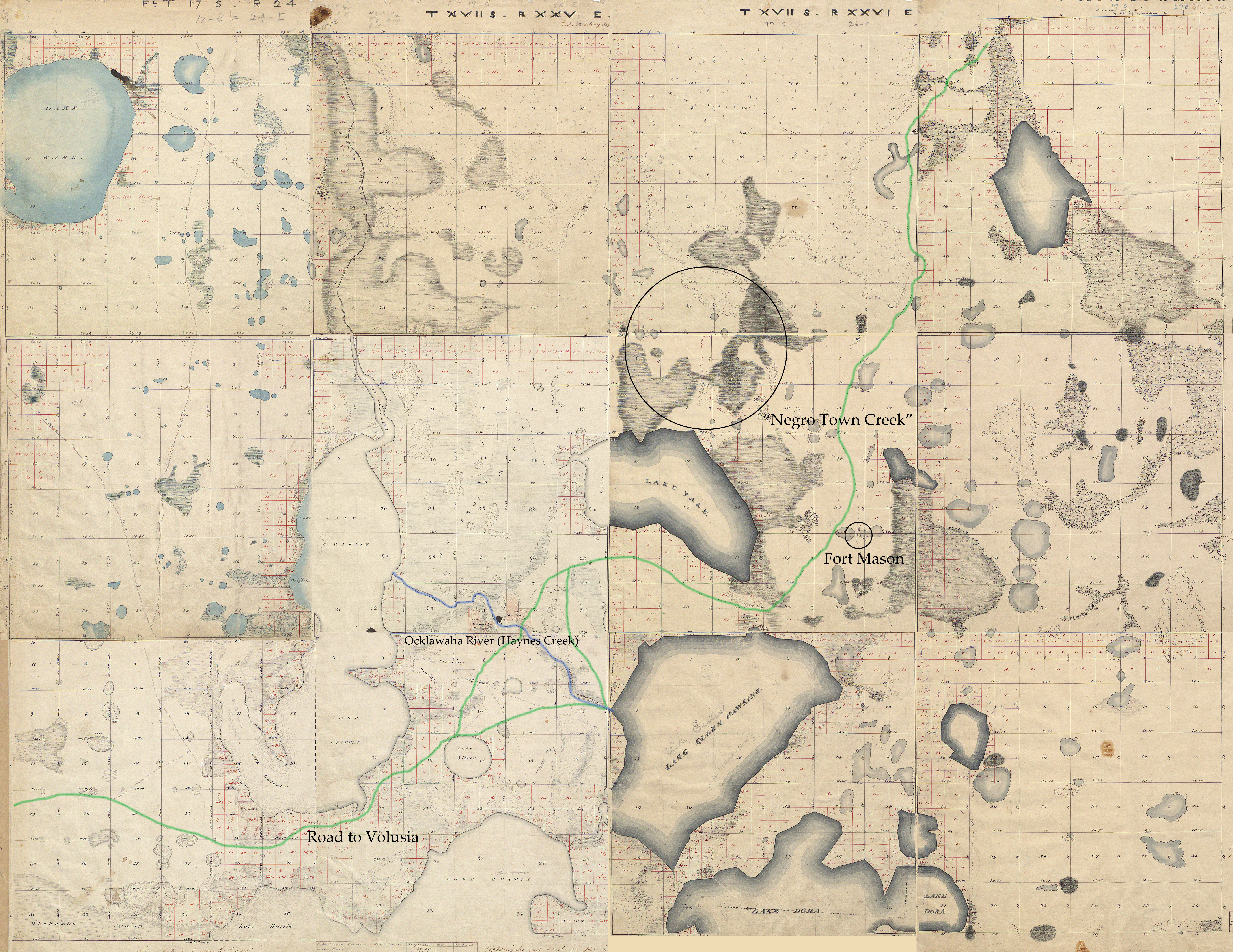 The war maps from this period are notoriously inaccurate, leaving out several nearby lakes including Lake Yale and Lake Harris. Lake Yale lies parallel to Lake Griffin – the historical source of the Ocklawaha – and I suspect that Jesup may have confused the two. In fact, even the land surveys reveal that the surveyors had mislabeled the lakes. When Jesup’s diary entry is read in the context of Lake Yale – the area where the town was located – the description aligns perfectly; he noted being at the lower end of the lake, and the town at its head. Moreover, the distance mentioned by John Lee Williams also matches; if you rotate the collage to match the orientation of the war maps, the stretch from Haynes Creek/ Ocklawaha River to the village is roughly “eight miles to the right”. My jaw dropped as I realized that everything finally fit – the references, the geography, the documents. I had found the evidence I had been searching for.