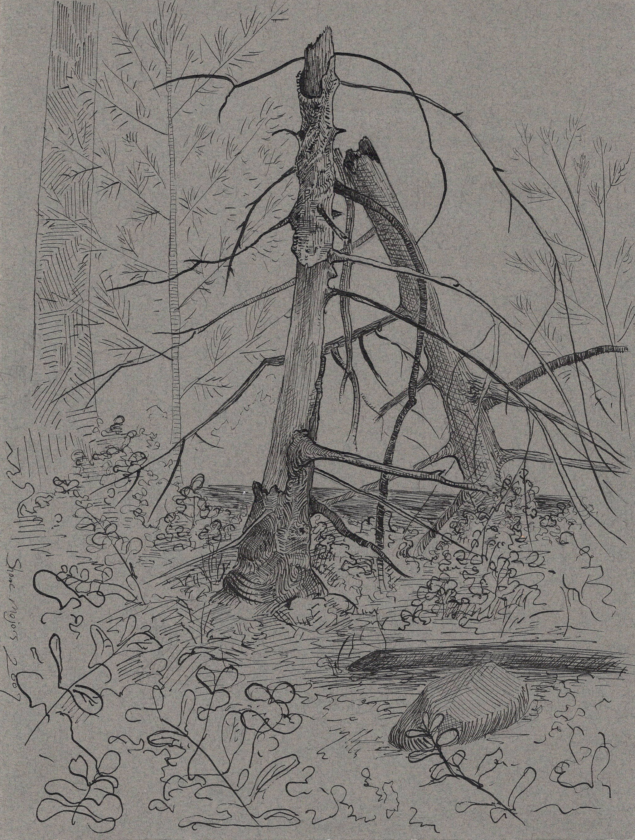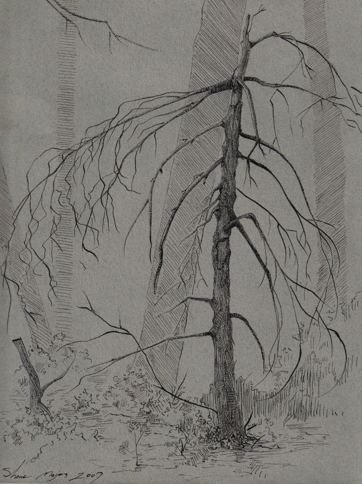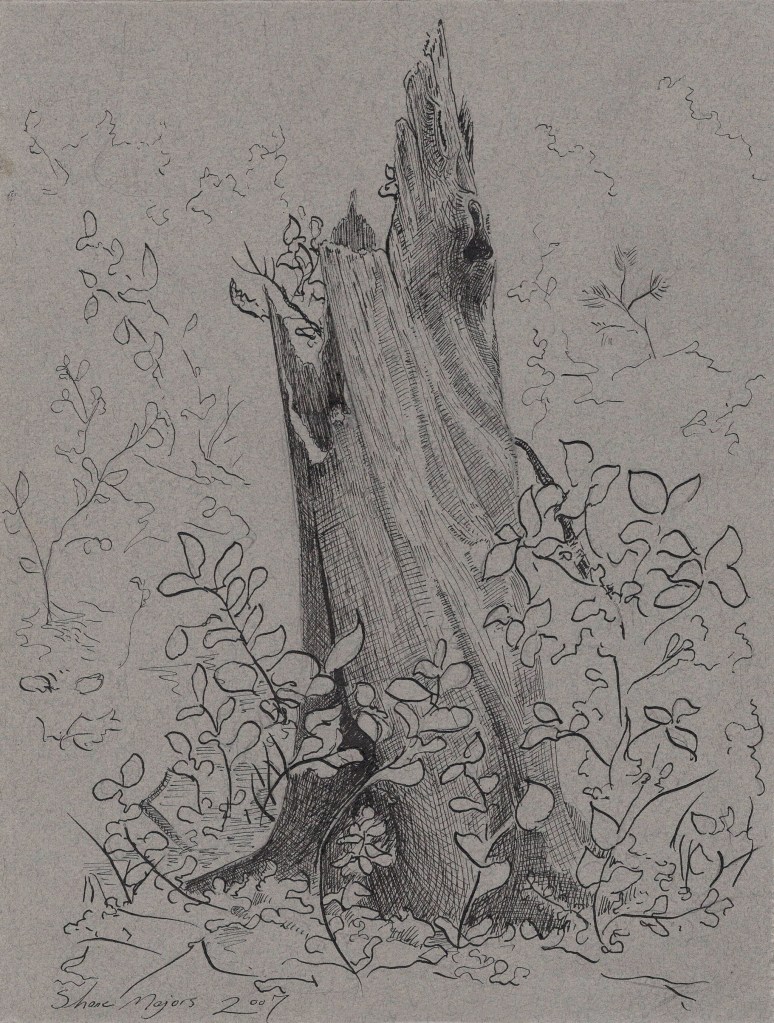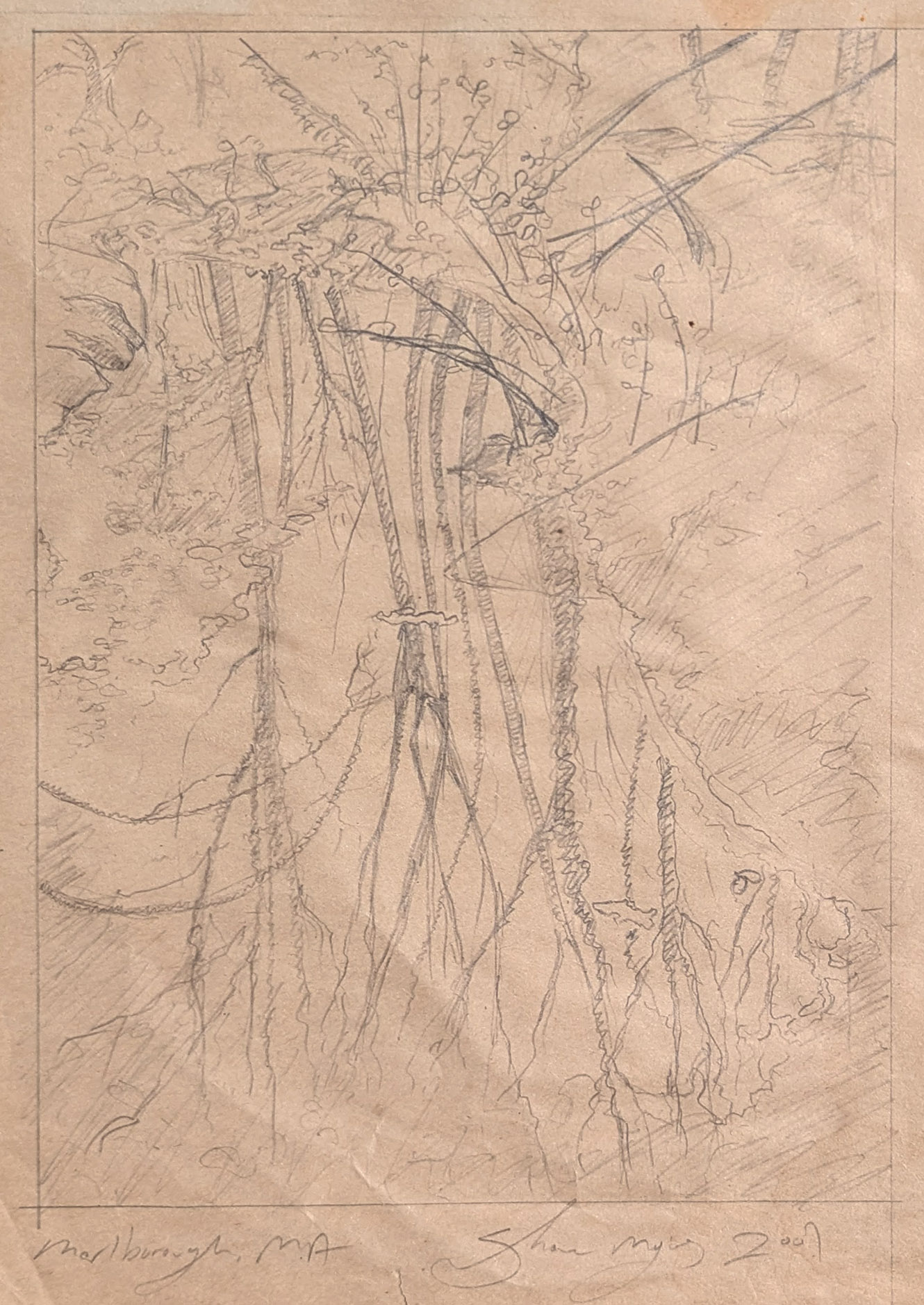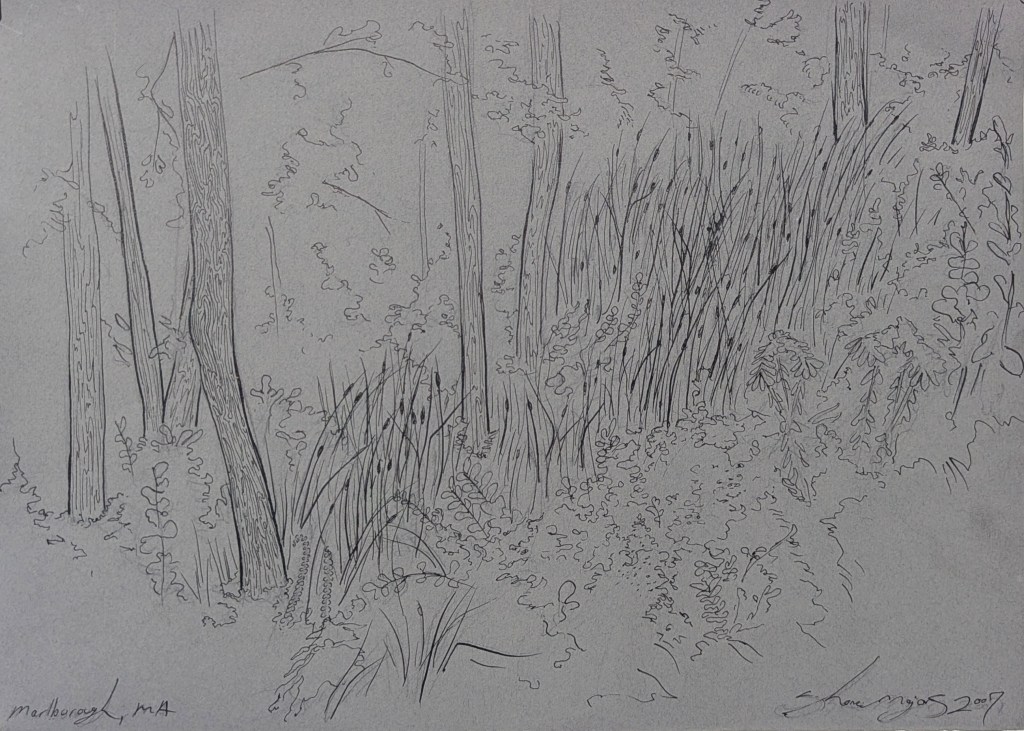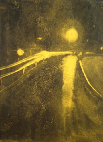 Arriving in Marlborough, Massachusetts in September of 2007 was bitter-sweet. I was happy to be out of the hustle and expense of New York and here with my best friend and her fiancé but now I had to start over. What was next? I hadn’t a clue and when I found out about the suicide of my friend, it made “un-slumping” myself all the more difficult. My mood was reflected in the work I created starting with the pen and ink series of dead trees called Stumped. I tended to focus the unkempt, the neglected and the blurred water reflections. In keeping with the dark mood, I did a series of experimental prints of night scenes, like the one on the right.